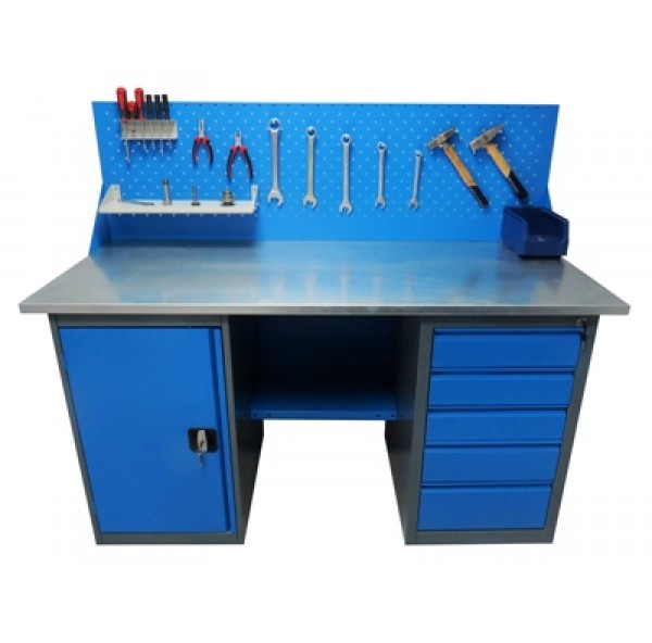 • Верстак укомплектован драйвером с пятью выдвижными ящиками разными по высоте и тумбой с полками.