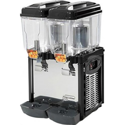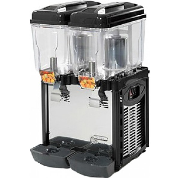 Сокоохладитель оснащен двумя контейнерами для напитков, расположенными в один ряд. Верхняя часть каждого контейнера покрыта крышкой, предоставляющей доступ к его внутреннему пространству. Розлив напитков осуществляется при помощи специальных кранов раздачи, под каждым из которых располагается подставка-каплесборник. Каждый контейнер оборудован собственной системой смешивания, гарантирующей идеальную консистенцию и равномерную температуру напитка внутри емкости. Электромеханическая панель управления, расположенная в боковой части корпуса прибора, позволяет легко управлять термостатом, регулируя температуру внутри контейнеров.
