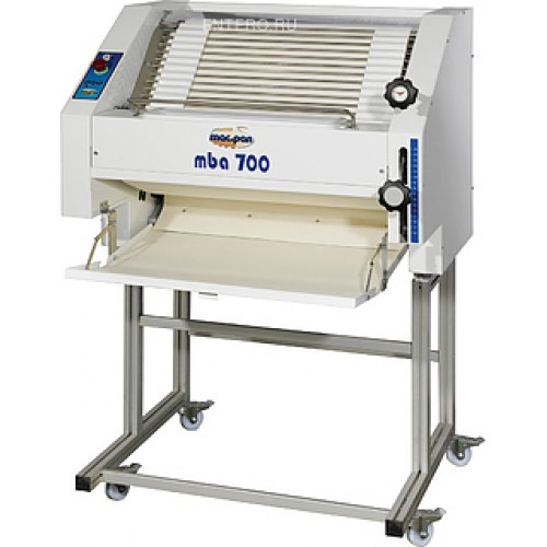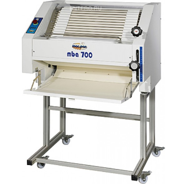 Тестозакаточная машина MAC.PAN MBA/2C используется на предприятиях пищевой промышленности и общественного питания, в пекарнях и кондитерских для формирования тестовых заготовок для батонов, багетов, саек, рогаликов и других видов хлебобулочных изделий. Модель оснащена функцией быстрой замены ленты без разбора машины. Толщина и длина тестовых заготовок устанавливается 2 регулировочными рычагами. Корпус выполнен из окрашенной стали, ролики - из пищевого полиэтилена.