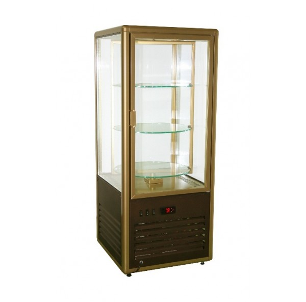 Холодильник для тортов, пирожных и других кондитерских изделий, с четырехсторонним остеклением позволит представить ваши десерты с любой стороны. Приятное сочетание золотисто-коричневых оттенков гармонично впишется в любой интерьер. Шкаф оснащён тремя вращающимися полками.