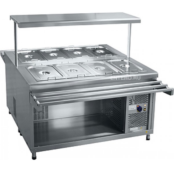 Салат-бар Abat ПВВ(Н)-140СМ-01 предназначен для кратковременного хранения и последующей раздачи салатов и других готовых блюд на предприятиях общественного питания и торговли. Модель оснащена охлаждаемой столешницей, 8 гастроемкостями GN 1/1 и нейтральным шкафом для хранения кухонного инвентаря.