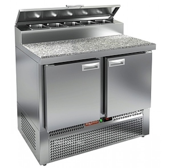 Охлаждаемый стол для пиццы HICOLD PZE2-11/GN (1/6H) выполнен из нержавеющей стали . Верх стола накрыт каменной столешницей.