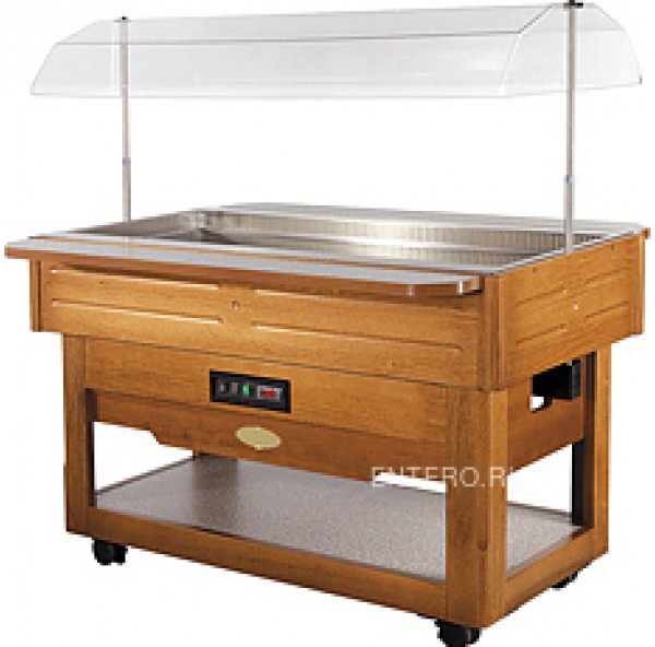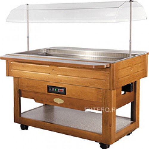 Салат-бар оборудован охлаждаемой ванной, в которую помещаются гастроемкости, стеклянным колпаком, подсветкой, колесиками и нижней полкой для хранения булочек и бутылок. Полки не поставляются в комплекте и предоставляются по запросу.