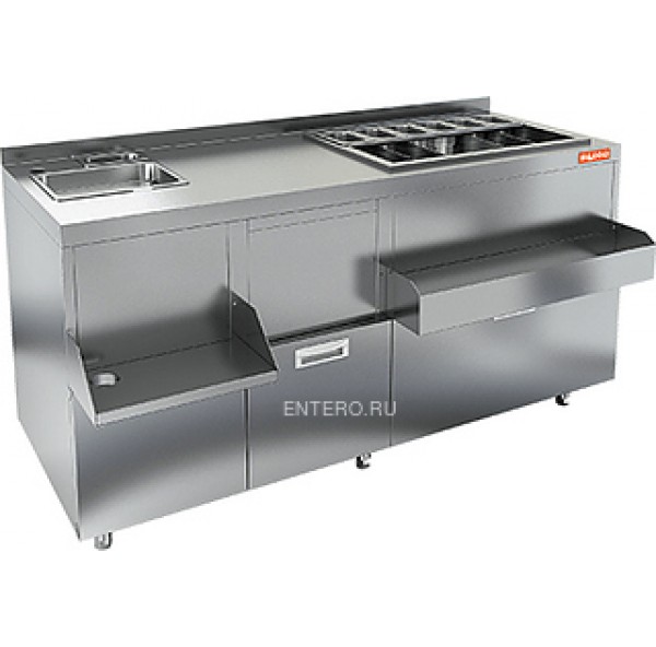 Барная станция с мойкой HICOLD НБМКС-16/6БПК используется в ресторанах, кинотеатрах, кафе и барах. Данная модель полностью изготовлена из нержавеющей стали.