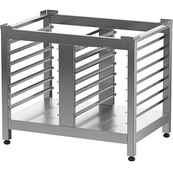 Стойки подставки, выполненные из трубы прямоугольного сечения, оснащены специальными направляющими, позволяющими устанавливать на них гастроемкости. В нижней части конструкции расположена практичная полка, а в верхней части, по углам, установлены упоры, которые позволяют предотвратить падение пароконвектомата. Все детали подставки выполнены из высококачественной нержавеющей стали AISI 304. При необходимости конструкция может быть разобрана.