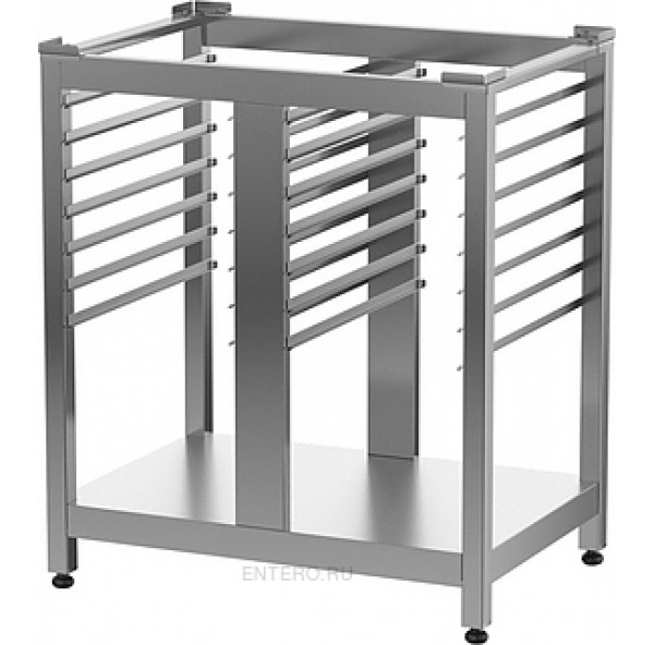 Стойки подставки, выполненные из трубы прямоугольного сечения, оснащены специальными направляющими, позволяющими устанавливать на них гастроемкости. В нижней части конструкции расположена практичная полка, а в верхней части, по углам, установлены упоры, которые позволяют предотвратить падение пароконвектомата. Все детали подставки выполнены из высококачественной нержавеющей стали AISI 304. При необходимости конструкция может быть разобрана.