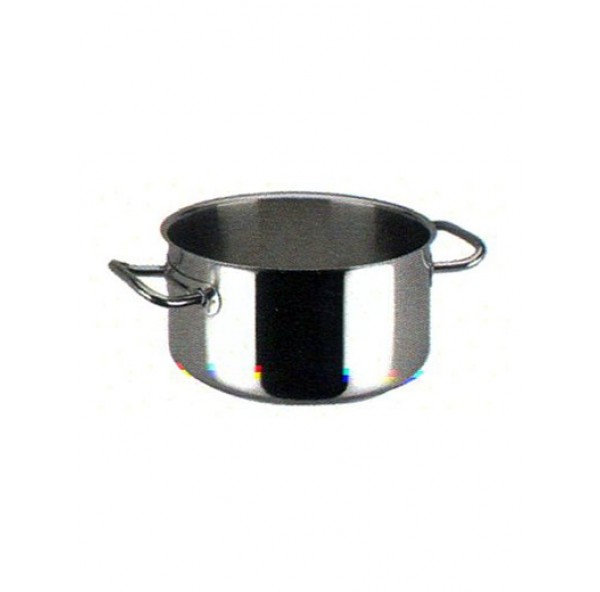 Кастрюля низкая, диаметр 32 см, высота 12,5 см, объем 9,5 л, поверхность снаружи глянцевая, внутри матовая, дно сэндвич, 2 ручки, полностью нерж.сталь 18/10 (без крышки)
