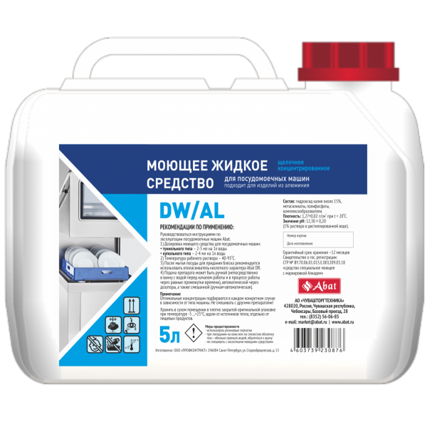 Концентрированное жидкое щелочное моющее средство DW / AL предназначено для мытья алюминиевой посуды и оборотной тары в посудомоечных машинах. Используется в сочетании с ополаскивателем "Abat DR".