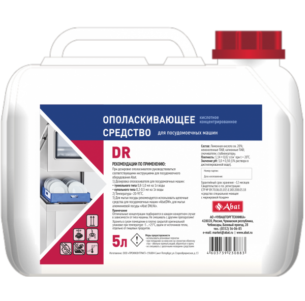 Жидкое кислотное ополаскивающее средство DR предназначено для ополаскивания посуды в посудомоечных машинах различного типа. Применяется после щелочных моющих средств.