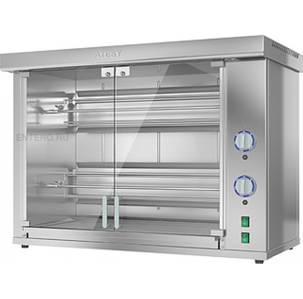 Гриль для кур ATESY Командор-2/2М используется на предприятиях общественного питания и торговли. Модель оснащена электродвигателем, раздельными терморегуляторами для каждой группы ТЭНов, съемными шампурами, внутренней подсветкой камер и поддоном для сбора жира. Корпус и все внутренние элементы выполнены из пищевой нержавеющей стали, дверцы - из термостойкого ударопрочного стекла с добавлением горного хрусталя, ручки дверей - из термостойкого пластика, и ножки - из пластмассы.