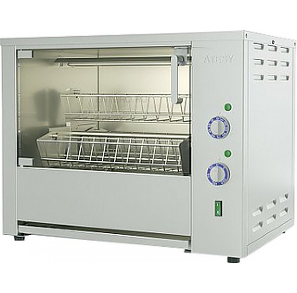 Гриль для кур ATESY Командор-4Э-Т используется на предприятиях общественного питания и торговли для приготовления куриных тушек, окорочков, крылышек и грудок, сарделек, шпикачек и колбасек. Модель оснащена электродвигателем, обеспечивающим вращение 4 садков. Дверцы выполнены из закаленного стекла, корпус - из нержавеющей стали AISI 430, садки - из нержавеющего прутка, ручки - из термостойкого пластика.