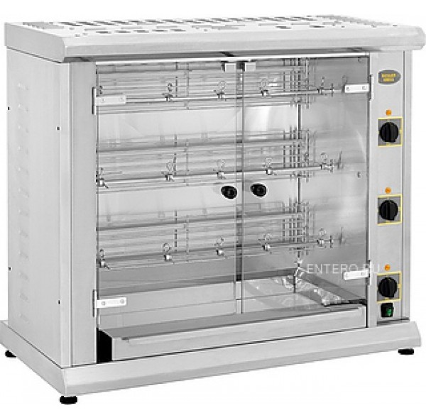 Гриль для кур Roller Grill RBE 120 Q используется на предприятиях общественного питания и торговли. В верхней части камеры имеется накопитель для готовой продукции, позволяющий поддерживать в горячем состоянии до 10 кур. Модель оснащена большим поддоном для сбора лишнего жира. Корпус выполнен из нержавеющей стали, дверцы - из тонированного стекла.