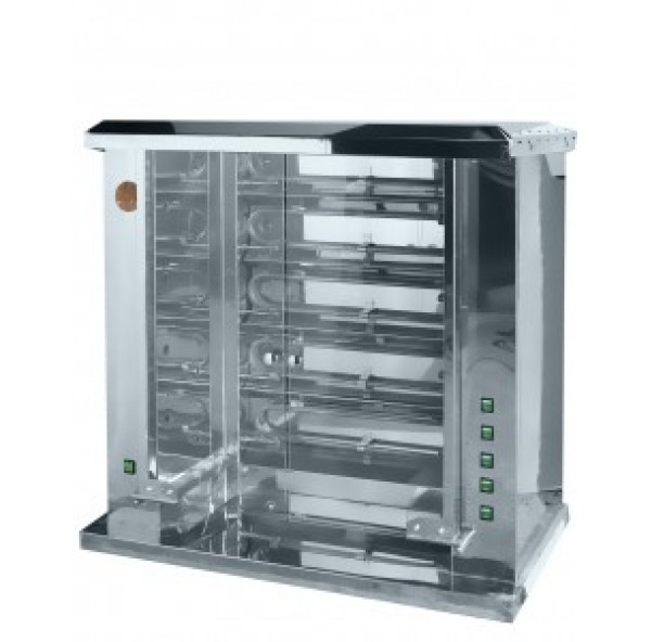 Электрический гриль для кур Ф5Ш2Э производства Grill Master предназначен для жарки кур целиком, а также окорочков и грудок. Такое оборудование не доставляет проблем в использовании, что обеспечивает его широкое применение в заведениях быстрого питания и уличной торговли. Максимальная для предлагаемой модели вместимость кур составляет 45 шт. При этом количество шампуров – 9. С использованием данного оборудования можно не только готовить аппетитные куры-гриль с румяной корочкой, но также сохранять их в горячем состоянии на протяжение некоторого времени. Подходящую для приготовления температуру обеспечивает такой тип нагревательного элемента, как ТЭН. Время приготовления занимает не более 65 мин. Имеется две распашных двери. Для удобства использования есть и подсветка. Электрический гриль для кур Ф5Ш2Э отличается простотой в обращении, система управления – электромеханическая.