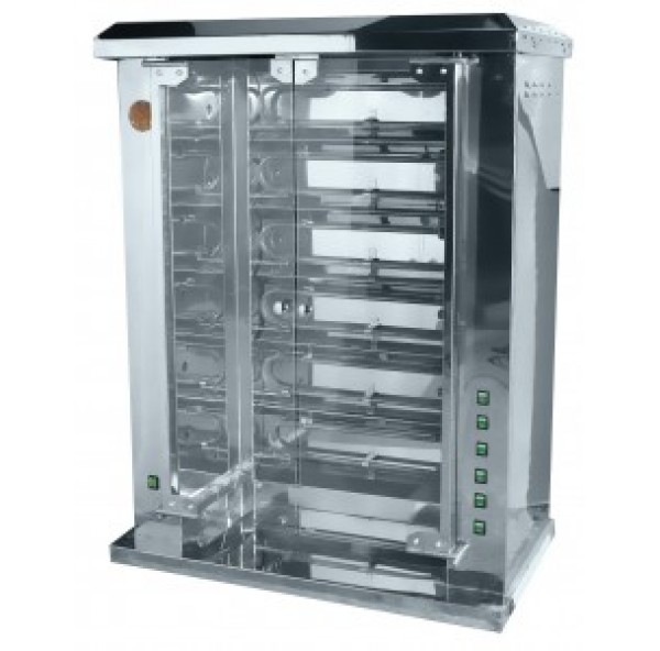 Электрический гриль для кур Ф6Ш2Э производства Grill Master предназначен для жарки кур целиком, а также окорочков и грудок. Такое оборудование не доставляет проблем в использовании, что обеспечивает его широкое применение в заведениях быстрого питания и уличной торговли. Максимальная для предлагаемой модели вместимость кур составляет 55 шт. При этом количество шампуров – 11. С использованием данного оборудования можно не только готовить аппетитные куры-гриль с румяной корочкой, но также сохранять их в горячем состоянии на протяжение некоторого времени. Подходящую для приготовления температуру обеспечивает такой тип нагревательного элемента, как ТЭН. Время приготовления занимает не более 65 мин. Имеется две распашных двери. Для удобства использования есть и подсветка. Электрический гриль для кур Ф6Ш2Э отличается простотой в обращении, система управления – электромеханическая.