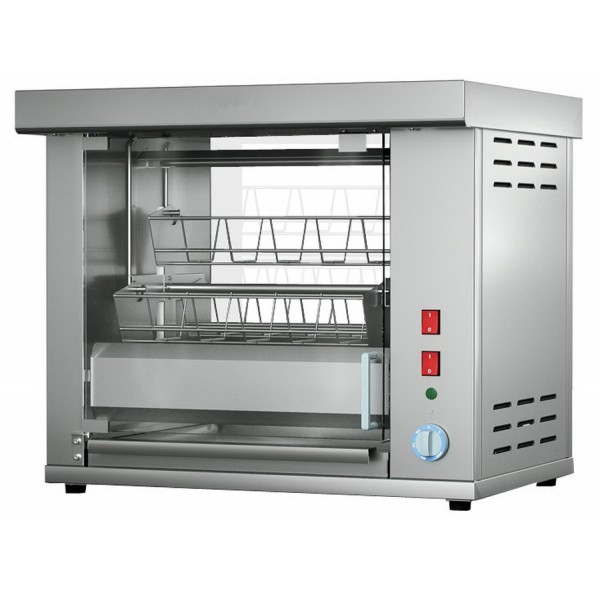 Гриль для кур ATESY Командор-4М используется на предприятиях общественного питания и торговли. Модель оснащена электродвигателем, терморегулятором, ТЭНами с отражателями тепла, съемными садками, внутренней подсветкой камеры и поддоном для сбора жира. Корпус и все внутренние элементы выполнены из пищевой нержавеющей стали, дверцы и задняя стенка - из термостойкого ударопрочного стекла с добавлением горного хрусталя, ручки дверей - из термостойкого пластика, и ножки - из пластмассы.