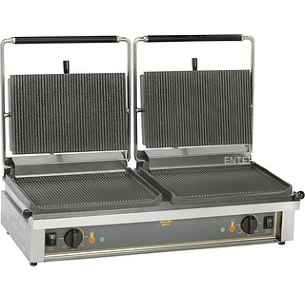 Прижимной гриль Roller Grill Double Panini R предназначен для жарки мяса, птицы, рыбы, овощей, а также для приготовления стейков, гамбургеров и горячих сэндвичей на предприятиях общественного питания и торговли. Модель оснащена поддоном для сбора соков и лишнего жира. Корпус выполнен из нержавеющей стали, ручки - из термостойкого материала.