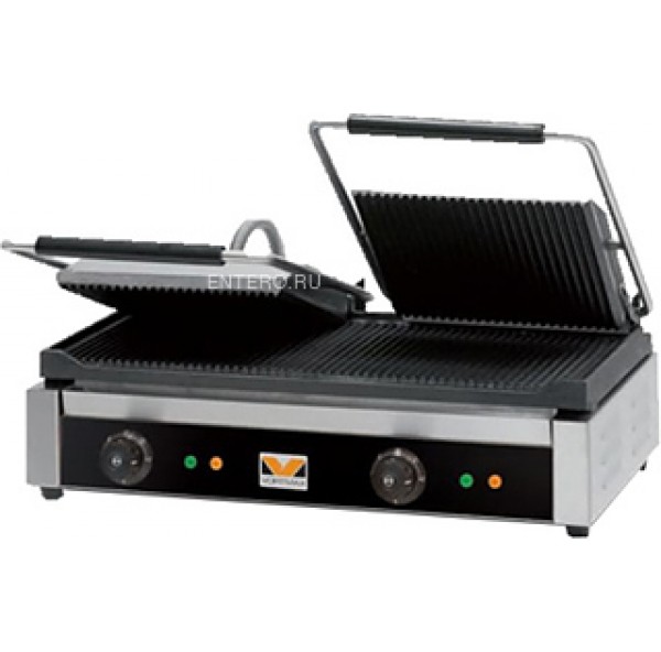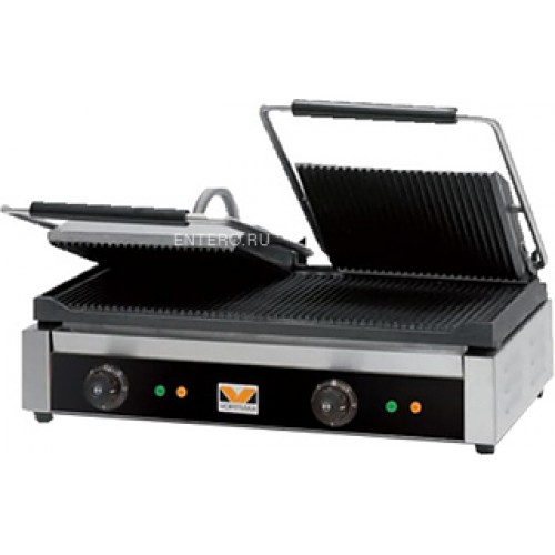 Прижимной гриль Vortmax CG D EST rr предназначен для жарки мяса, птицы, рыбы, овощей, а также для приготовления стейков, гамбургеров и горячих сэндвичей на предприятиях общественного питания и торговли. Модель оснащена регулируемыми термостатами. Верхняя рабочая поверхность состоит из 2 независимых друг от друга частей, на каждой из которых температура выставляется отдельно. Рифленая поверхность создает аппетитную хрустящую корочку. Корпус выполнен из нержавеющей стали.