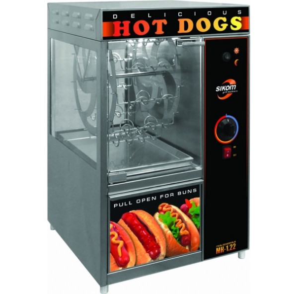 Компактный карусельный гриль МК-1.22 с люлечным вертелом на 22 сосиски. Оснащен подогреваемым ящиком для булочек. Специальный тормоз вертела обеспечивает простоту загрузки и выгрузки. Яркая подсветка привлекает внимание к процессу приготовления. Имеется выдвижной ящик для булочек.