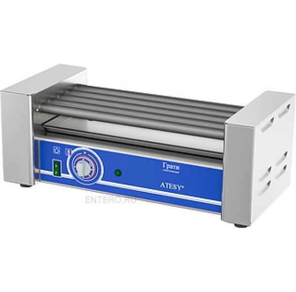 Роликовый гриль ATESY Грати-5.440-02 предназначен для обжаривания сосисок, сарделек, мясных и рыбных батончиков цилиндрической формы на предприятиях общественного питания и торговли. Модель оснащена специальным регулятором для регулировки температуры и электродвигателем для вращения роликов. Ролики и корпус выполнены из нержавеющей стали.