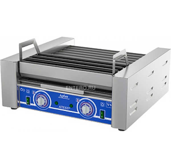 Роликовый гриль ATESY КГ-7.3-570-01 предназначен для обжаривания сосисок, сарделек, мясных и рыбных батончиков цилиндрической формы и котлет на предприятиях общественного питания и торговли. Модель оснащена специальными ступенчатыми регуляторами для регулировки температуры и электродвигателем для вращения роликов. Ролики и корпус выполнены из нержавеющей стали, покрытие секций для котлет - из тефлона.