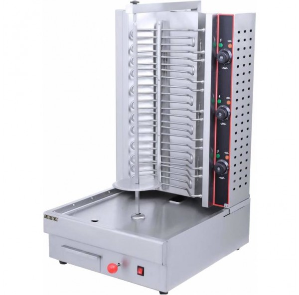 Гриль для шаурмы Airhot GRE-80 используется на предприятиях общественного питания и торговли для приготовления мясной начинки для шаурмы. Принцип действия заключается в том, что приготовленная мясная нарезка насаживается на специальный нож, который вращается вокруг своей оси около электрических ТЭНов до ее полной готовности. Модель оснащена поддоном для сбора жира. Корпус выполнен из нержавеющей стали.
