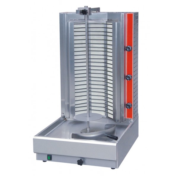 Гриль для шаурмы GASTRORAG HES-E2 используется на предприятиях общественного питания и торговли для приготовления мясной начинки для шаурмы. Вертикальная модель оснащена 3 зонами нагрева, автоматическим вращением вертела и жиросборником. Корпус выполнен из нержавеющей стали.