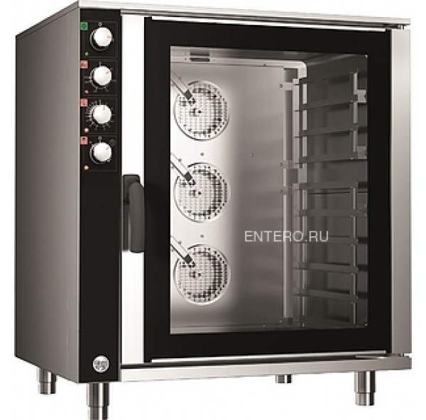 Устройство оснащено 3 реверсными вентиляторами с регулируемой скоростью. Печь полностью выполнена из нержавеющей стали AISI 430. Дверь оборудована силиконовым уплотнением и двойным закалённым стеклом, коорое может быть откинуто, что при необходимости позволяет легко осуществлять чистку оборудования изнутри и между стекол.