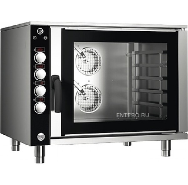 Устройство оснащено 2 реверсными вентиляторами с регулируемой скоростью. Печь полностью выполнена из нержавеющей стали AISI 430. Дверь оборудована силиконовым уплотнением и двойным закалённым стеклом, коорое может быть откинуто, что при необходимости позволяет легко осуществлять чистку оборудования изнутри и между стекол.