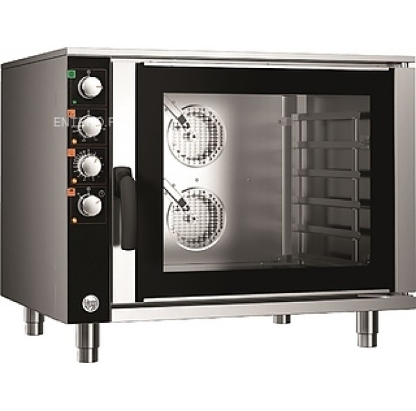 Устройство оснащено 2 реверсными вентиляторами с регулируемой скоростью. Печь полностью выполнена из нержавеющей стали AISI 430. Дверь оборудована силиконовым уплотнением и двойным закалённым стеклом, коорое может быть откинуто, что при необходимости позволяет легко осуществлять чистку оборудования изнутри и между стекол.