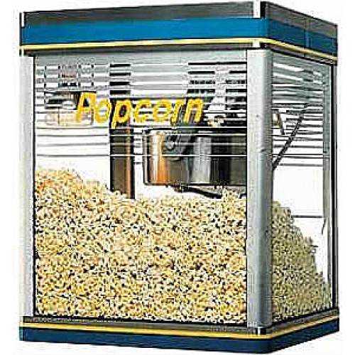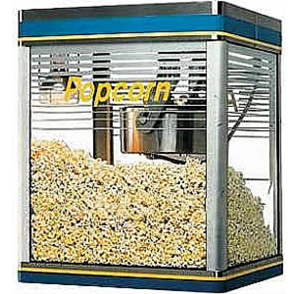 Попкорн аппарат Star Galaxy 18-Y в стиле модерн имеет синюю и желтую полосы вверху и внизу, никелированный стальной котел, раму из нержавеющей стали, гравировку на стекле, лампу в защитном кожухе в основании для подогрева готовой продукции, алюминиевые стойки, панели и дверцы из закаленного стекла.