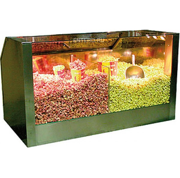 Витрина тепловая ТТМ VTP3-120n оснащена внутренней подсветкой, задней дверцей, системой кондиционирования и ящиком для сбора отходов и неоткрывшихся зерен попкорна.