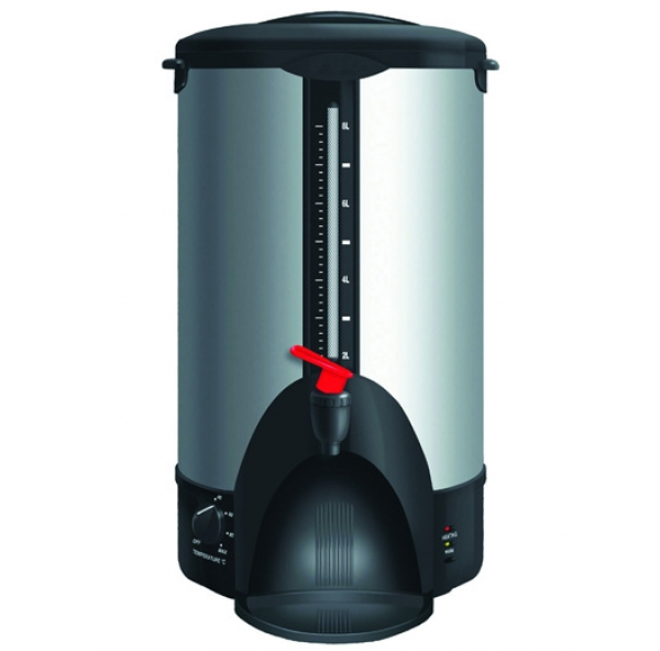 Кипятильник электрический заливной настольный, автономный, с терморегулятором, резервуар емкостью 8 л с краном для розлива, материал корпуса - нерж.сталь/черная пластмасса.