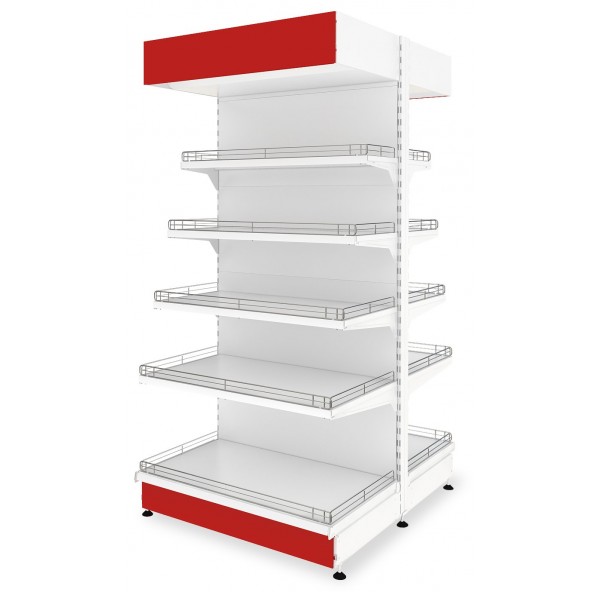 Стеллаж островной предназначен для продажи товара с двух сторон и установки в середине торгового зала, может быть дополнен комплектом торцевых полок глубиной 200, 300, 400 и 500 мм., ограничителями полок и пластиковыми ценникодержателями.